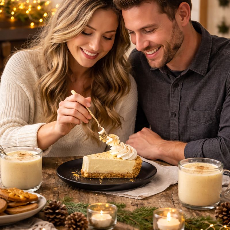 For drinks, eggnog or coffee pairs beautifully. The richness of the cheesecake balances well with something warm and simple.
