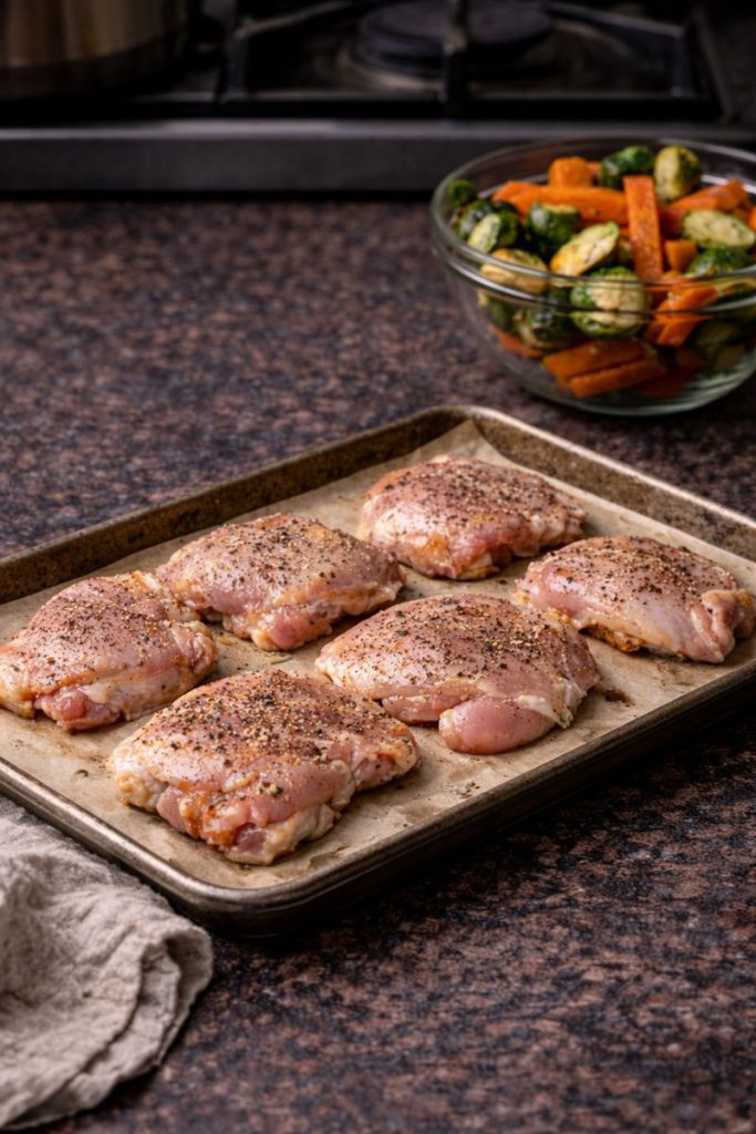 Season the chicken thighs simply with salt and pepper. Toss the vegetables with olive oil and seasoning so everything goes into the oven ready to roast.