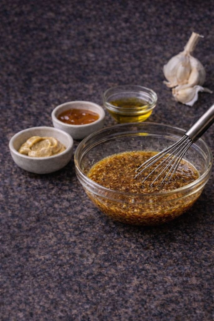 In a bowl, whisk together the honey, Dijon mustard, whole-grain mustard, olive oil, and garlic. The sauce should look glossy and slightly thick, with visible mustard seeds throughout.