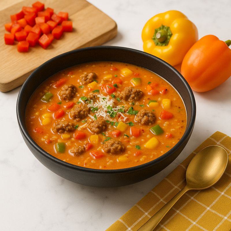 Red, green, and sweet peppers soften into the broth and bring both sweetness and texture. This is where the soup truly earns its “stuffed pepper” name.